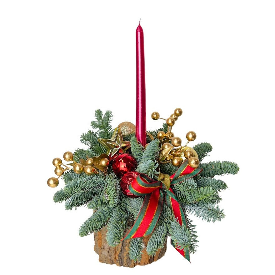 Enchanting Evergreen Centrepiece on a mini pot log comes with fresh nobilis fir, artificial gold winterberries, Christmas baubles and candle.