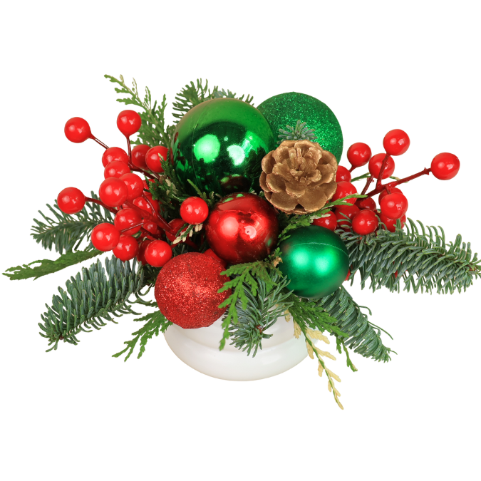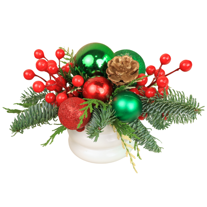 Santa Joy in Ceramic Pot comes with fresh nobilis fir, dried pine cones, artificial winterberries and christmas baubles.